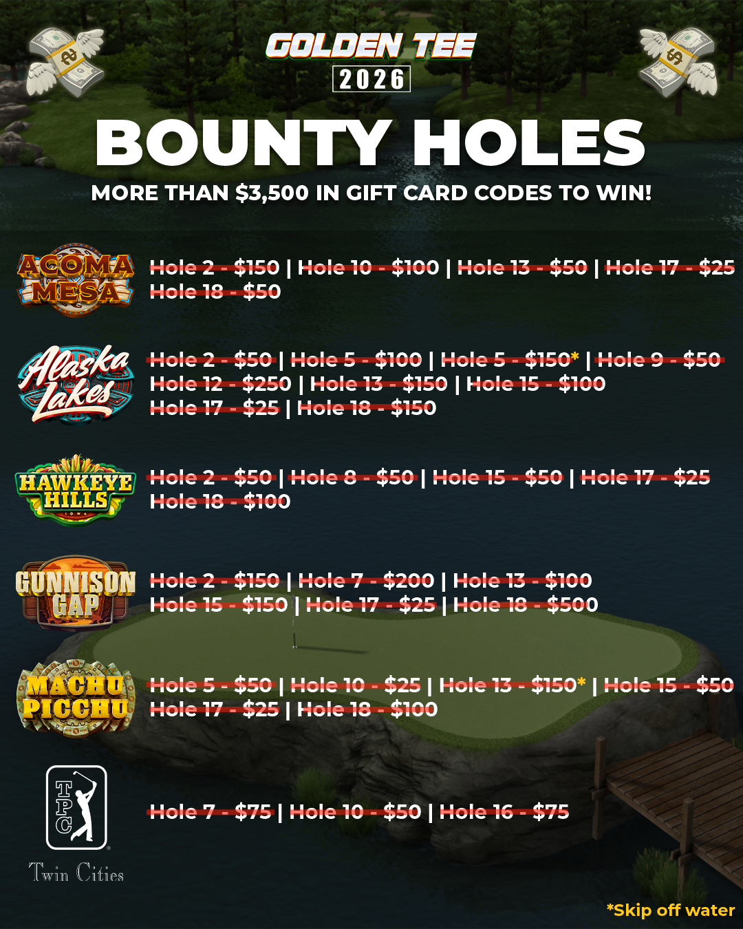 The Bounty Holes are BACK! We’re offering a large prize pool for Bounty Holes, with over $3,500 in Golden Tee gift card codes up for grabs. One of the bounties reaches an incredible $500! The rest of the bounties range from $25 to $500 per shot.