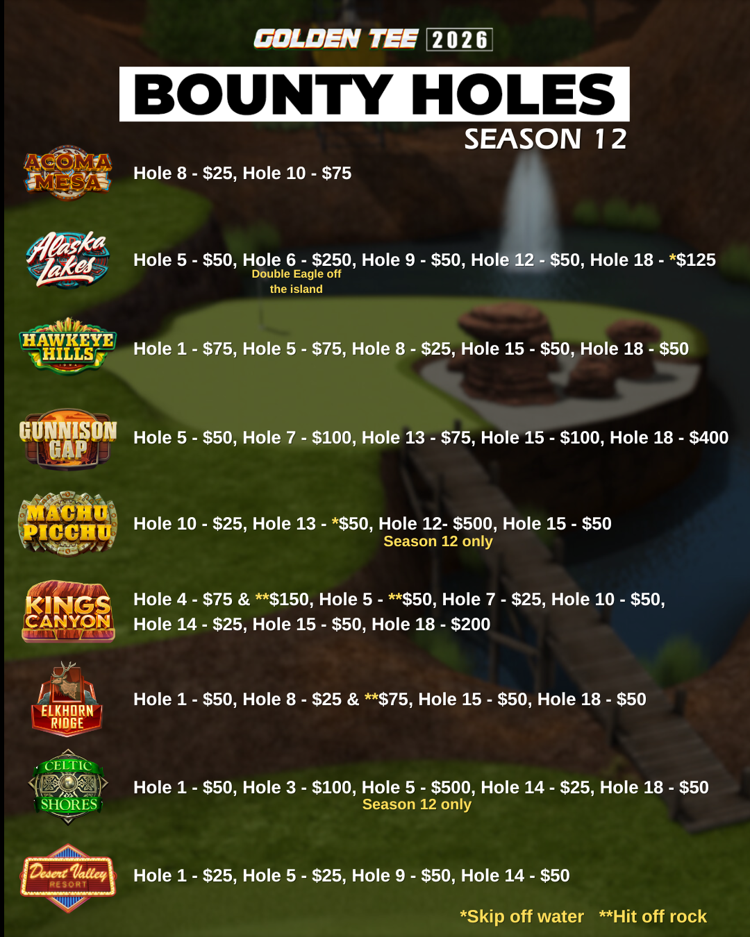The Bounty Holes CONTINUE IN 2026! We’re offering another large prize pool for Bounty Holes! As always, Golden Tee gift card codes are up for grabs. These bounty holes are specific to Season 12 pins and tees which includes 4 more courses.