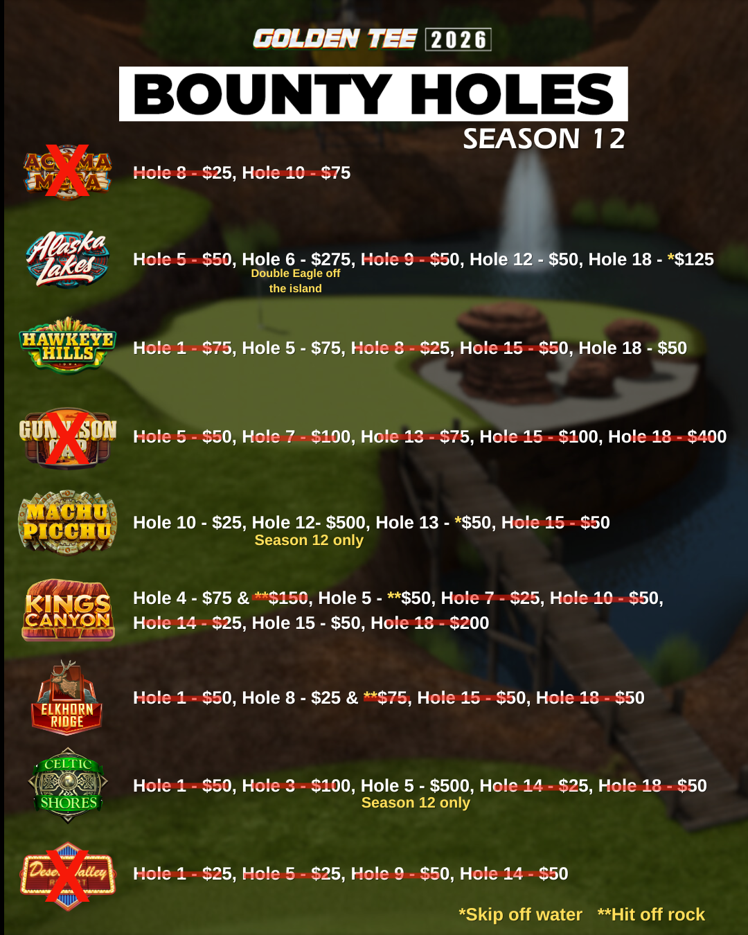 The Bounty Holes CONTINUE IN 2026! We’re offering another large prize pool for Bounty Holes! As always, Golden Tee gift card codes are up for grabs. These bounty holes are specific to Season 12 pins and tees which includes 4 more courses.